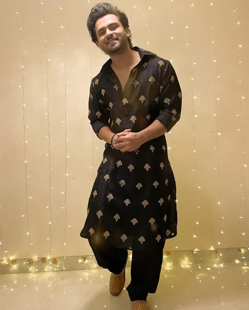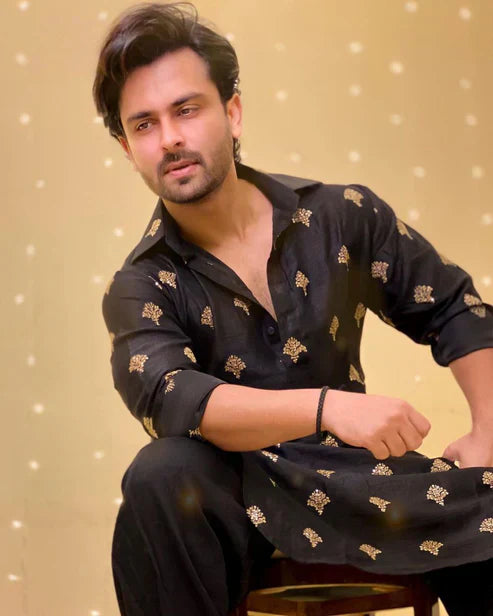 This Black Sequence Embroidered Work Men's Kurta with Pajama Is Created by trendy Kurta,This Hand-stitched Kurta Is Made of 100% Pure Cotton Fabric With Having embroidered work Over It. Our Attractive embroidery Add More Charm to Your Look, Wear This at Any Time Because the Fabric Is So Smooth to Skin That You Will Love It.