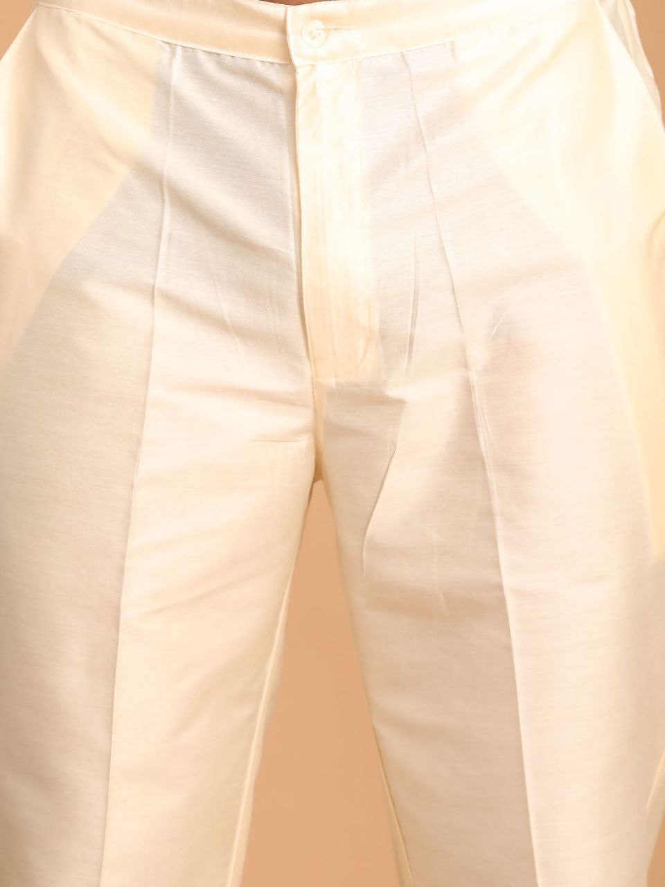 Beige color printed kurta and solid cream color viscose pant with floral print nehru jacket.