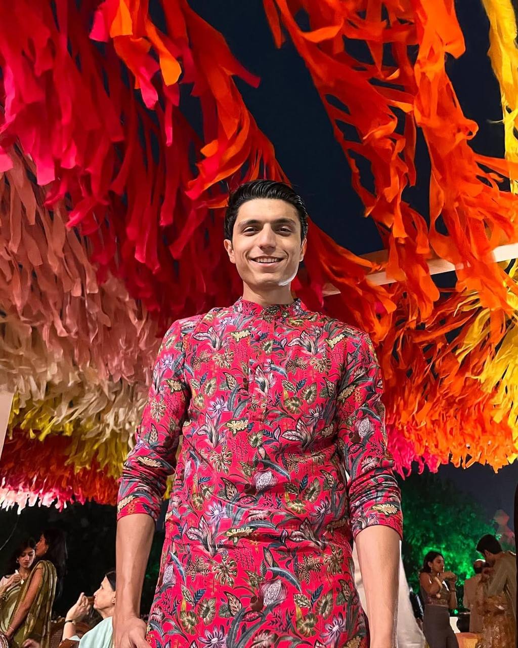 Featuring an RED FLORAL kurta in silk base with forest print. It is paired with contrasting off-white aligarhi pants.