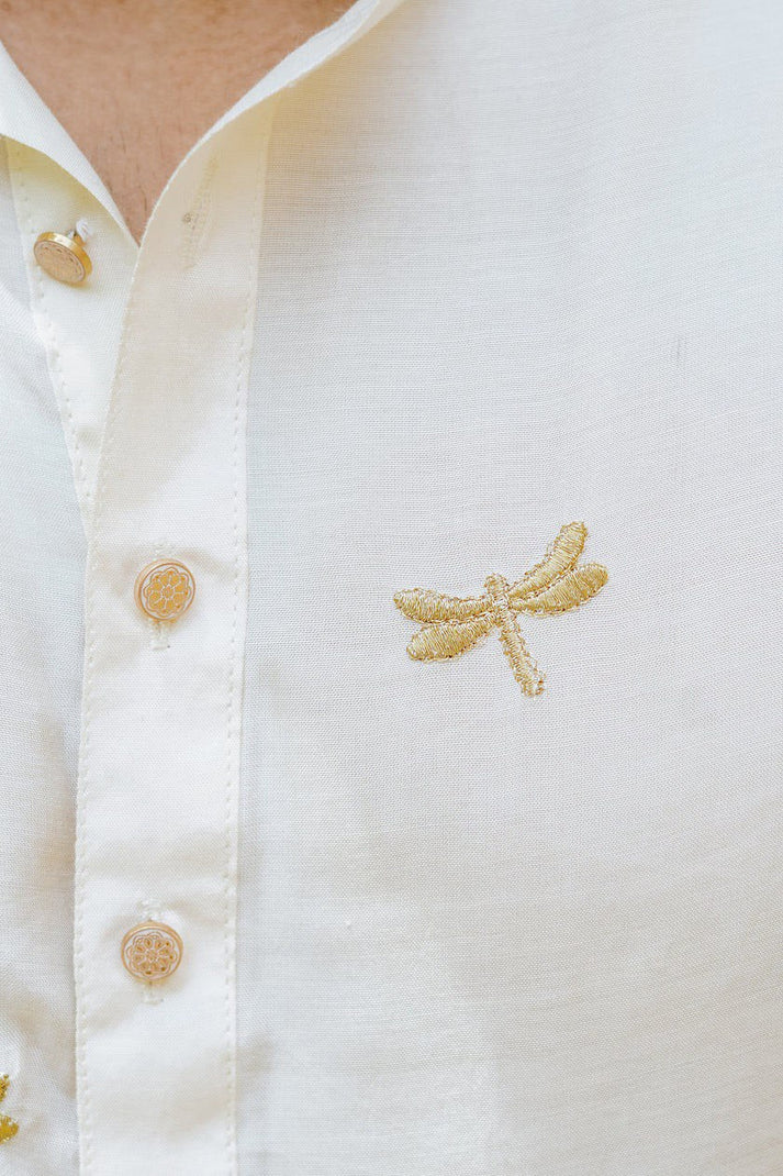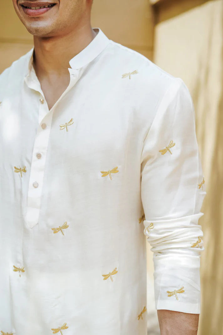 White Dragon Fly Embroidered Work Men's Kurta with Pajama